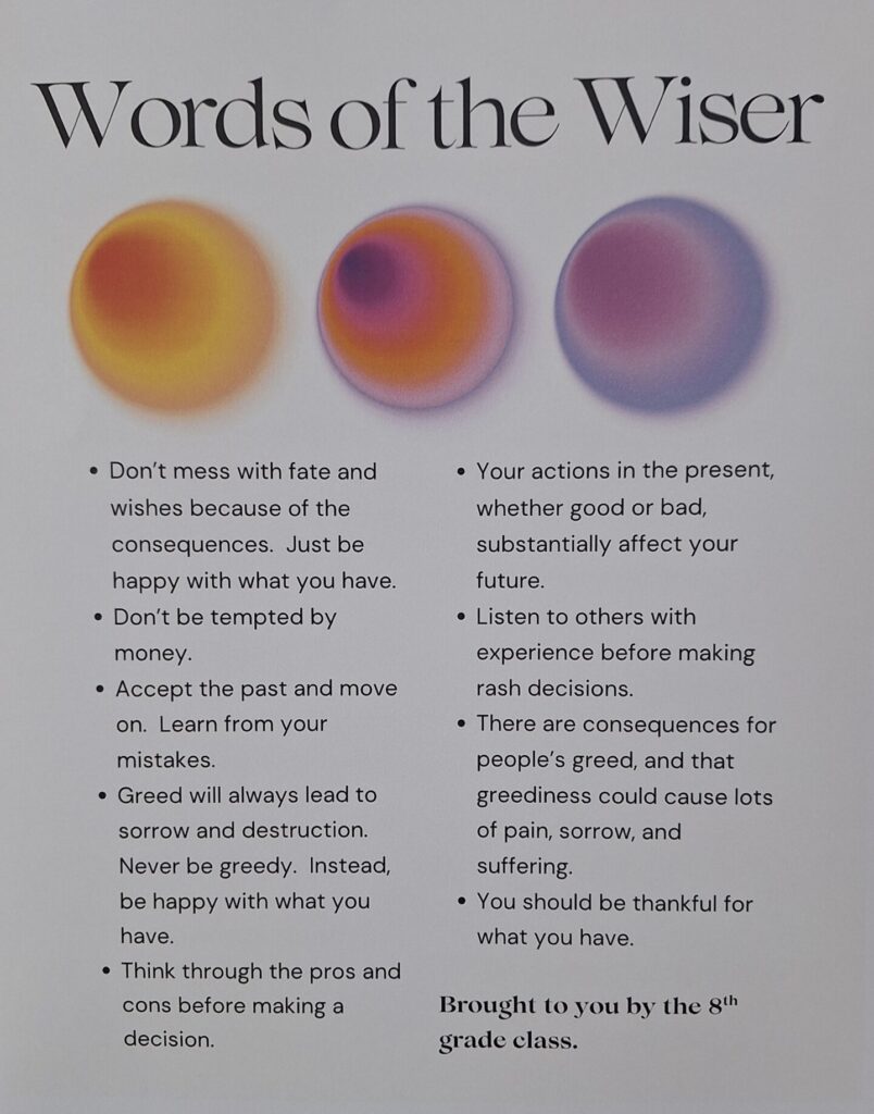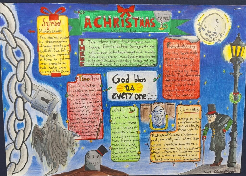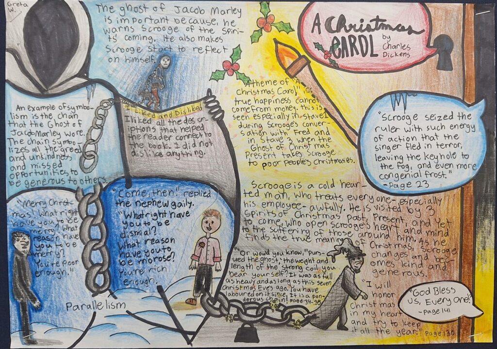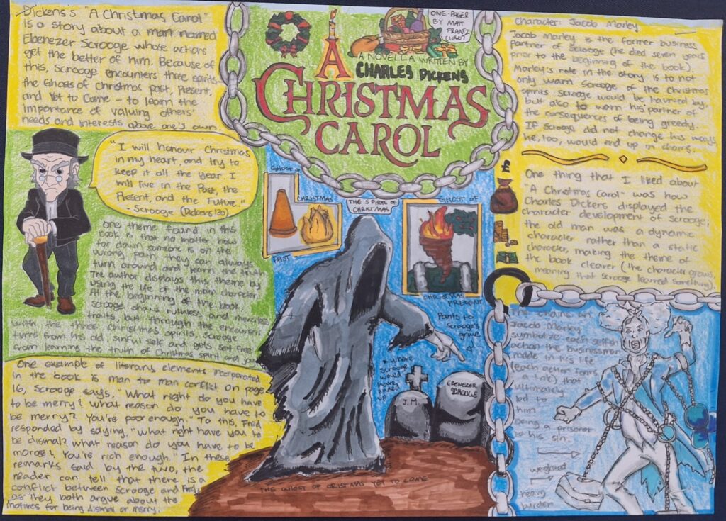 A horror unit at a Christian school?  Yes.  Amazingly, we can learn much from reading stories in the horror genre.  There are even great Christian authors who fall in this category (Frank Peretti).  Horror shows that evil is real and that it can be overcome; we, as Christians, have the ultimate victory over evil.  The eighth graders focused largely on themes as we read.  Here are a few that they noticed: Guilt will drive you mad.  Be continent with what you have.  Honor those that go before you.  Listen to those who are wiser than you.  At the end of the unit, we read “A Christmas Carol”, and students recognized that no one is too far gone to be redeemed; greed for money will drive away things that truly matter; and we can be thankful and joyful in all circumstances.  Below are some words of the wiser they offered to characters in one of our stories, some of their one-pagers from “A Christmas Carol”, and pictures of them at work.