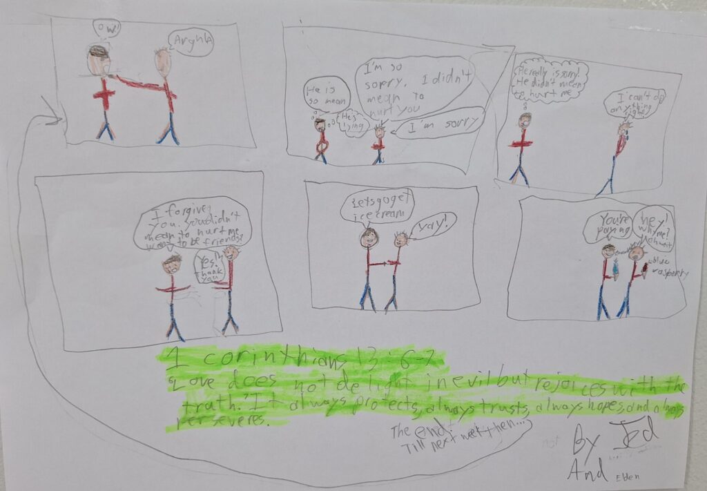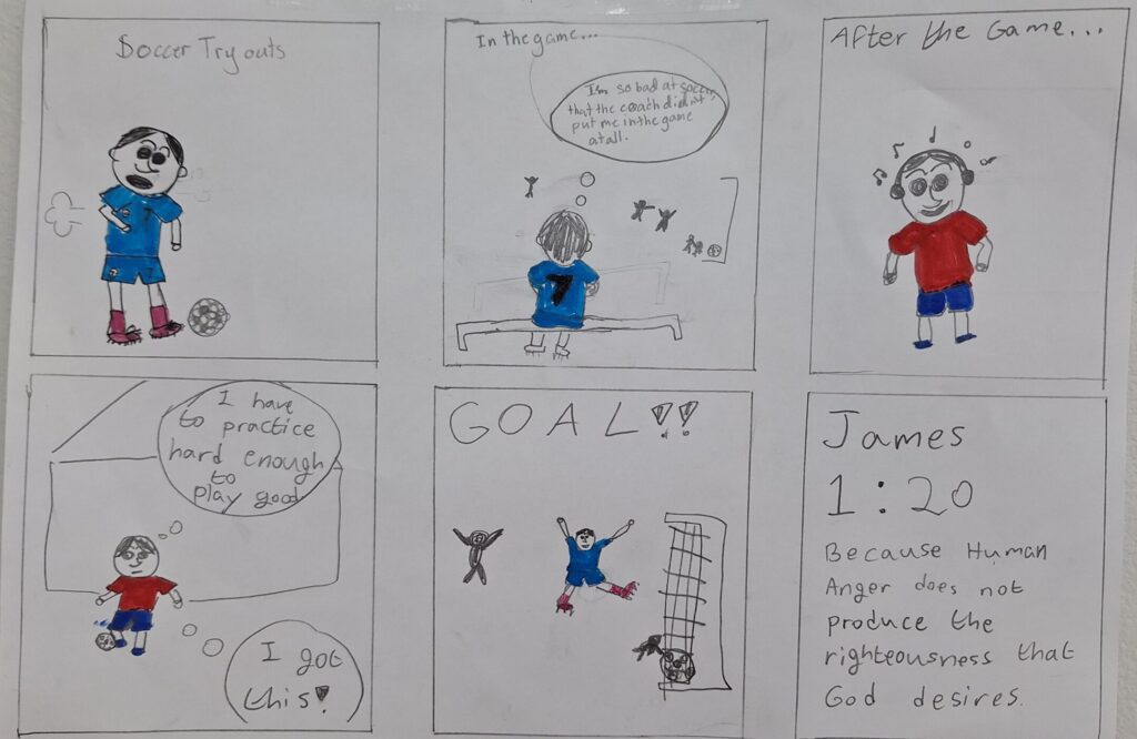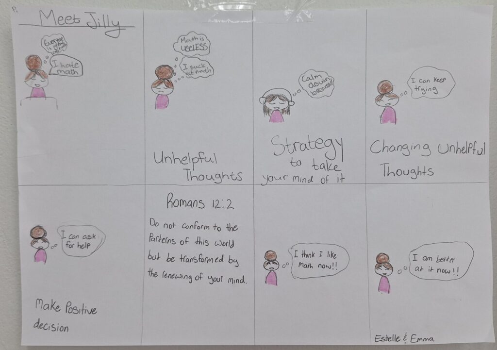 This was a great start to our last meeting of the semester as we wrapped up our discussion of changing our mindset when things don’t go our way.  Students partnered up, created a comic strip of a situation that might cause strong emotions in Middle School and how a student could change their thinking to make better choices.  They also incorporated Bible verses to show how God calls us to be different and to have a different mindset than the world.  You can see some of the final products below.